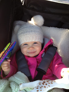 Maddie started music class once we moved and she absolutely loves it. The drum and shakers are her favorite instruments. She is eating up a storm, she likes just about everything - except pasta, don't get me started - but is just starting to feed herself. Jake and I were convinced that she hated getting her hands dirty that's why she wasn't doing it. :) She is on the verge of crawling; she couldn't do tummy time for two months after her surgery but now she is finally used to it. She pushes herself backwards when she is on her tummy; we are getting close to forward. Quite helpful in cleaning the floors. ;) A couple of weeks after we moved up here she got her first tooth! She now has two and I think her top two will be in any day now; she is a drool machine. And she also got her first cold which, three weeks later, we are finally snot free. On Valentine's Day we had our 3 month check up after Maddie's surgery; our new cardiologist said her heart looks great and we won't have to go back for another year! It was such a relief.